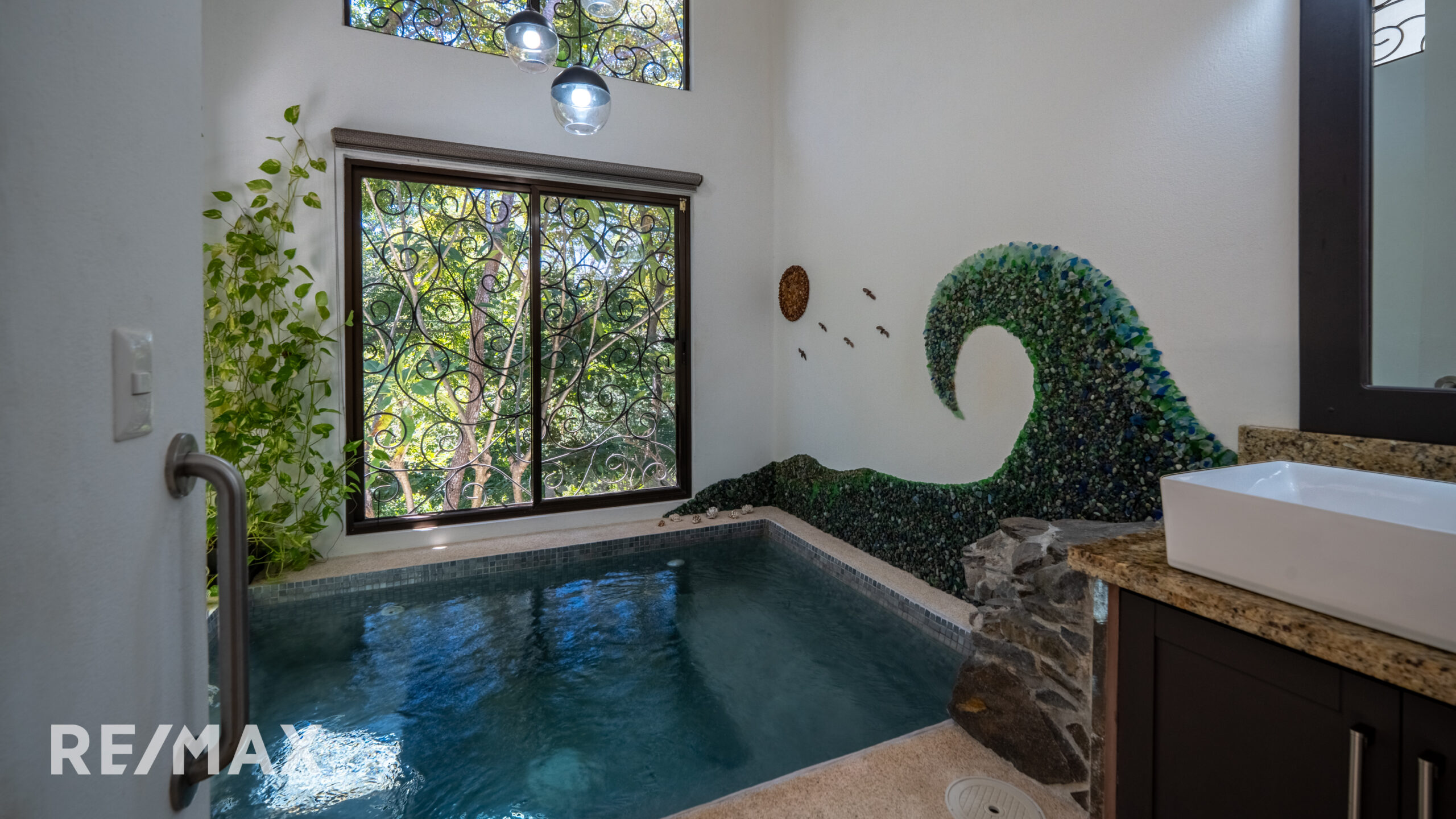 The custom-designed home is a contemporary sanctuary, offering floor-to-ceiling windows, an expansive granite island kitchen, and a spacious open-concept layout that blends seamlessly with the outdoors. The primary bedroom features a walk-through closet, en-suite bathroom with 12 windows and a unique private indoor saltwater plunge pool, designed to offer relaxation with stunning views. An additional bedroom, bathroom, enclosed garage, and laundry room complete the space.
